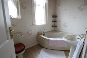 Three piece suite comprising corner bath with mixer tap and shower, wash hand basin and low level WC.