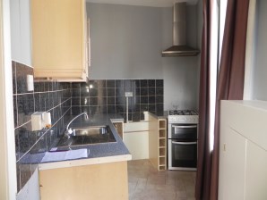 Range of fitted wall and floor units, stainless steel sink with mixer tap, freestanding electric oven, stainless steel extractor hood.