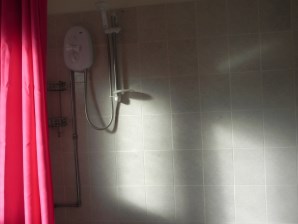 Three piece suite comprising low level W.C, wash hand basin, bath with electric shower over, radiator.