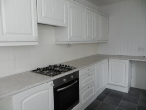 Range of modern wall and floor units, stainless Steel sink unit with drainer, built in oven, hob and hood. Part PVC clad part timber clad and part tiled walls.