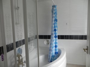 With corner bath, pedestal basin and low level w.c. Tiled walls. Radiator.