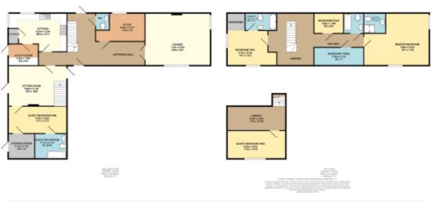 Entrance Hallway Entrance doorway, tiled flooring, galleried staircase to the first floor, boiler, radiator, doorway to rear aspect, access to the w.c. Kitchen/Diner Utility Room Base units with housing and plumbing for washing machine, space for a fridge, tiled flooring, doorway leading to the rear garden. Study Lounge With log burning stove. Downstairs Cloakroom WC, washbasin Sitting Room With galleried staircase. Guest Bedroom One Access to the guest bathroom and store room, radiator. Guest Bathroom Panel bath with shower over, w.c, wash basin. Guest Bedroom Two Doorway from the galleried Library Store Room