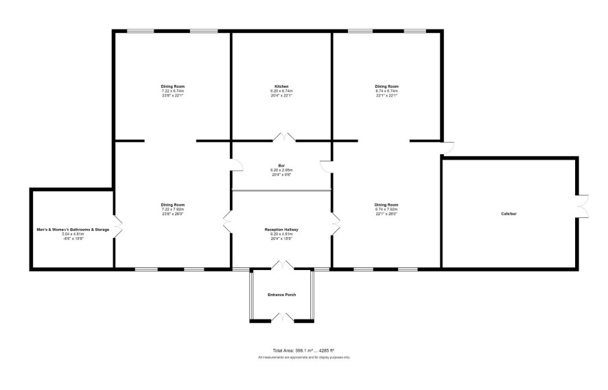The floor areas as taken from VOA are as follows… Ground Floor Restaurant 391.2 m2 / 4,210.8 sq.ft. Ground Floor Internal storage 109.7 m2 / 1,180.8 sq.ft. Ground Floor External storage 14.2 m2 / 152.8 sq.ft Total 515.1 m2 / 5,544.4 sq.ft