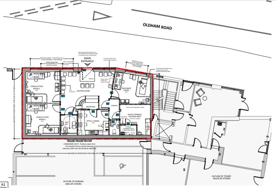 Description Modern ground floor self-contained commercial unit situated beneath residential apartments. Previously utilised as a medical centre but considered suitable for a variety of retail, office or commercial uses, subject to the required consents being obtained. Internally the unit is fitted with air-conditioning, suspended ceilings incorporating LED lighting, supplementary electric wall heaters and modern shop frontage. The unit currently extends to approximately 1,267 sqft (117.67 m2) (taken from VOA) and briefly provides waiting room with reception, 3 no. treatment rooms, office, storage, DDA WC and staff WC. To the rear are 3 designated car parking spaces. Location Prominently situated fronting Oldham Road (A62), close to the junction with Great Ancoats Street and Swan Street on the fringe of Manchester City Centre. Tenure: long leasehold Title number: tbc{tab} Council Tax Band : n/a Local Authority: Manchester