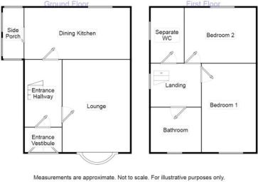Two bedroom semi-detached house with gardens & drive. Porch, hallway, lounge, kitchen diner, rear porch, first floor landing, bedroom one, bedroom two, bathroom, WC. Gardens front & rear & driveway. Gas central heating & double glazing where fitted.