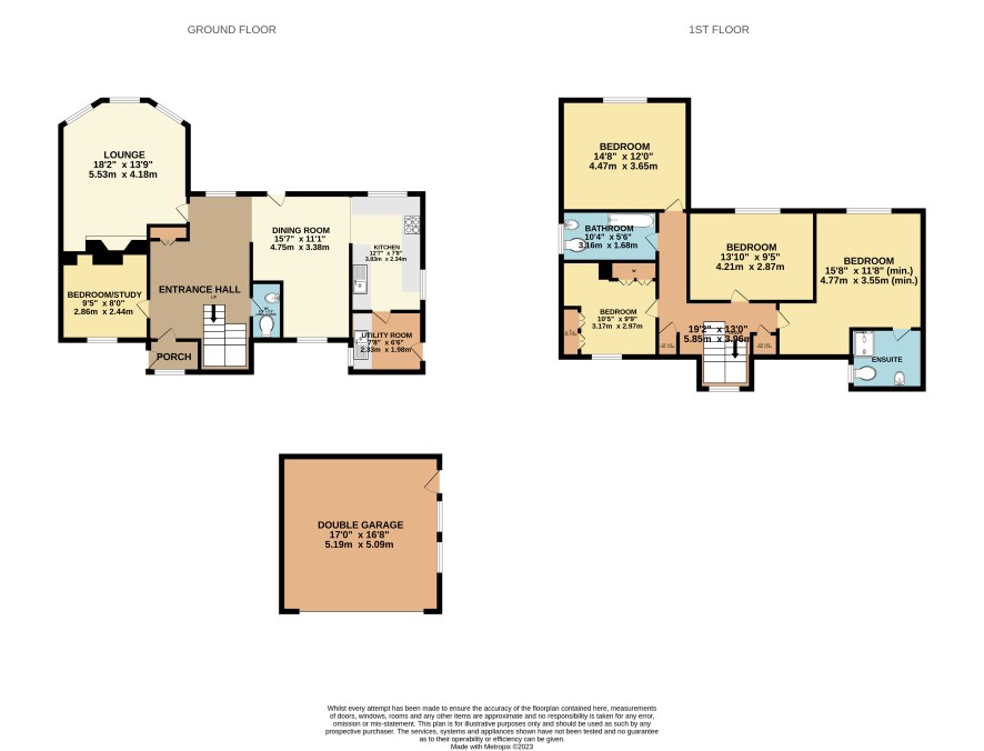 GROUND FLOOR Hallway 19' 7'' x 10' 5'' (5.96m x 3.17m) Living Room 18' 2'' x 13' 9'' (5.53m x 4.19m) WC Study/Bedroom Five 9' 5'' x 8' 0'' (2.87m x 2.44m) Dining Room 15' 7'' x 11' 1'' (4.75m x 3.38m) Kitchen 12' 7'' x 7' 8'' (3.83m x 2.34m) Utility Room 7' 9'' x 6' 6'' (2.36m x 1.98m) FIRST FLOOR Landing 13' 0'' x 9' 9'' (3.96m x 2.97m) Master Bedroom 15' 8'' x 11' 8'' (4.77m x 3.55m) Ensuite 7' 8'' x 6' 5'' (2.34m x 1.95m) Bedroom Two 14' 8'' x 12' 0'' (4.47m x 3.65m) Bedroom Three 13' 10'' x 9' 5'' (4.21m x 2.87m) Bedroom Four 10' 5'' x 9' 9'' (3.17m x 2.97m) Family Bathroom 10' 5'' x 5' 6'' (3.17m x 1.68m) OUTSIDE Detached Double Garage 17' 0'' x 16' 8'' (5.18m x 5.08m)