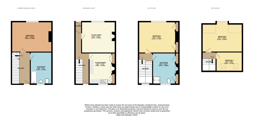 GROUND FLOOR Entrance Hall Sitting Room - 4.05m x 4.41m Kitchen/Diner - 3.40m x 4.08m FIRST FLOOR Bedroom One - 5.24m x 4.10m Bathroom - 4.07m x 3.40m TOP FLOOR Bedroom Two - 5.27m x 4.33 (into bay) Bedroom Three - 3.38m x 2.52m LOWER GROUND FLOOR Workshop - 3.97m x 5.52m Bathroom Two - 3.38m x 2.52m OUTSIDE Enclosed garden to the rear with outbuilding