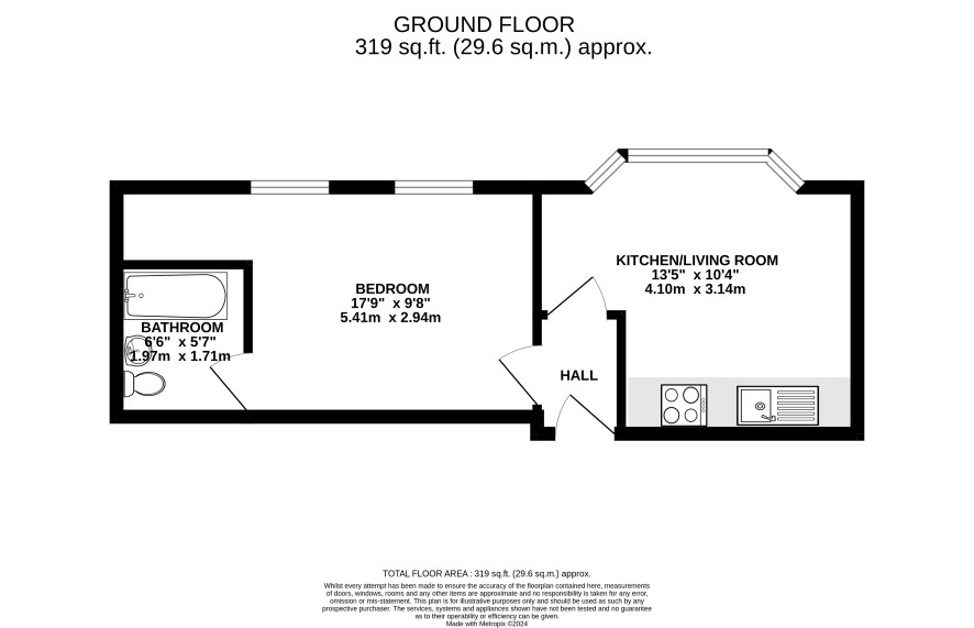 Entrance Hall Living Room/Kitchen/Diner: 13'5" x 10'4" Bedroom: 17'9" x 9'8" Bathroom: 6'6" x 5'7"