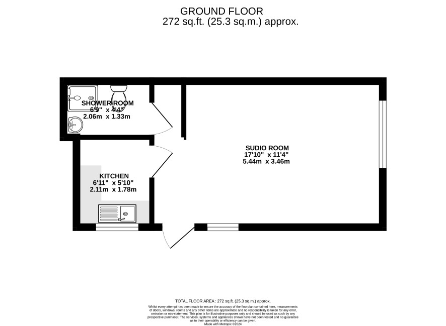 Studio Room: 17'10" x 11'4" Kitchen: 6'11" x 5'10" Shower Room: 6'9" x 4'4"