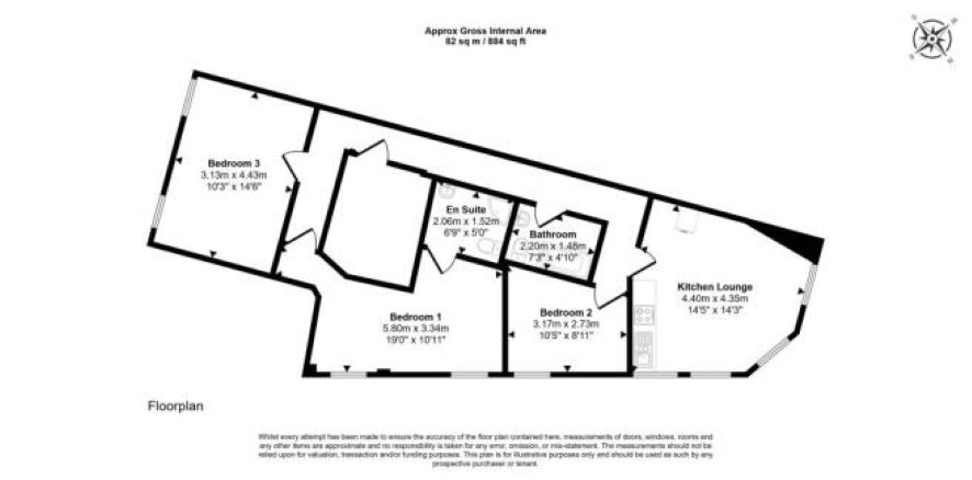 Communal Entrance: Entrance Hall: Living/kitchen/dining room: 14'5" x 14'3" Bedroom one: 19'0" x 10'11" Ensuite: 6'9" x 5'0" Bedroom Two: 10'5" x 8'11" Bedroom Three: 10'3" x 14'6" Bathroom: 7'3" x 4'10"