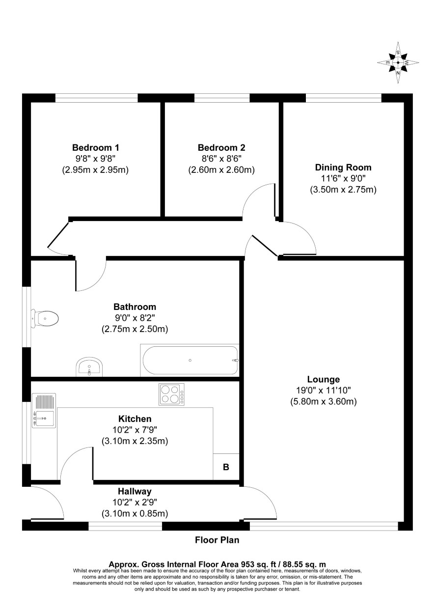 Hallway Bedroom 1 - 9'8" x 9'8" (2.95m x 2.95m) Bedroom 2: - 8'6" x 8'6" (2.60m x 2.60m) Dining Room - 11'6" x 9'0" (3.50m x 2.75m) Lounge - 19'0" x 11'10" (5.80m x 3.60m) Bathroom - 9'0" x 8'2" (2.75m x 2.50m) Kitchen - 10'2" x 7'9" (3.10m x 2.35m)