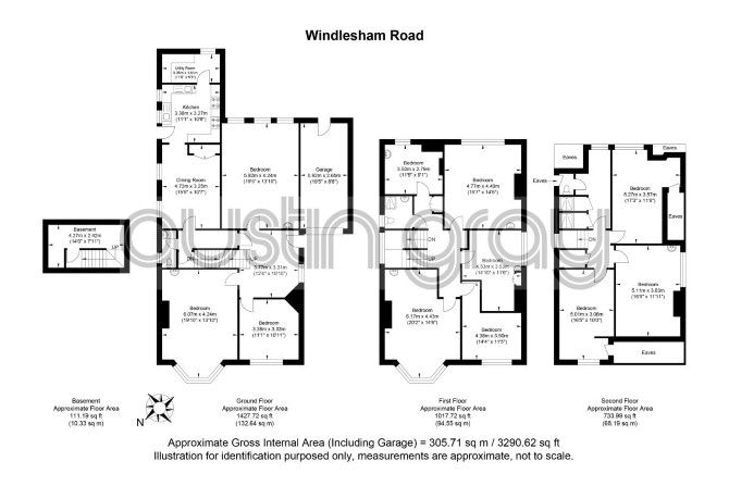Basement - 4.27m x 2.42m Total Floor Area - 10.33 sqm Ground Floor - Entrance Hall - 3.77m x 3.31m Kitchen - 3.38m x 3.27m Utility Room - 3.35 x 1.61 Dining Room - 4.72m x 3.25m Bedroom 5.92m x 4.24m Bedroom 6.07m x 4.24m Bedroom 3.38m x 3.33m w/c Total Floor Area - 132.64 sqm First Floor Bedroom - 6.17m x 4.43m Bedroom - 4.38m x 3.50m Bedroom - 4.53m x 3.53m Bedroom - 3.50m x 2.79m Bedroom - 4.77m x 4.40m Ensuite shower room/w/c - Total Floor Area - 94.55 sqm Second Floor Bedroom - 5.01m x 3.06m Bedroom - 5.11m x 3.63m Bedroom - 5.27m x 3.57m Shower Room / wc Total Floor Area - 68.19 sqm Garage - 5.92m x 2.65m Interested parties must rely on their own measurements. Total Gross Internal Floor Area - 305.71 sqm