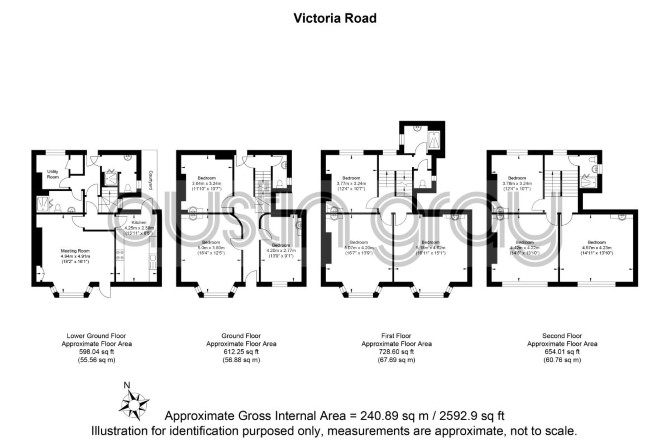 Lower Ground Floor - Kitchen - 4.25 x 2.58 Utility / shower room - Reception Room - 4.94 x 4.91 Shower room/ w/c - Ground Floor - Bedroom - 5.0 x 3.80 Bedroom - 3.64 x 3.24 Bedroom - 4.20 x 2.17 W/C - First Floor - Bedroom - 5.18 x 4.62 Bedroom - 5.07 x 4.29 Bedroom - 3.77 x 3.24 Shower room W/C Second Floor - Bedroom - 4.57 x 4.25 Bedroom - 4.42 x 4.22 Bedroom - 3.78 x 3.24 Shower room - Total Floor Area - 234 sq.m. (taken from EPC)