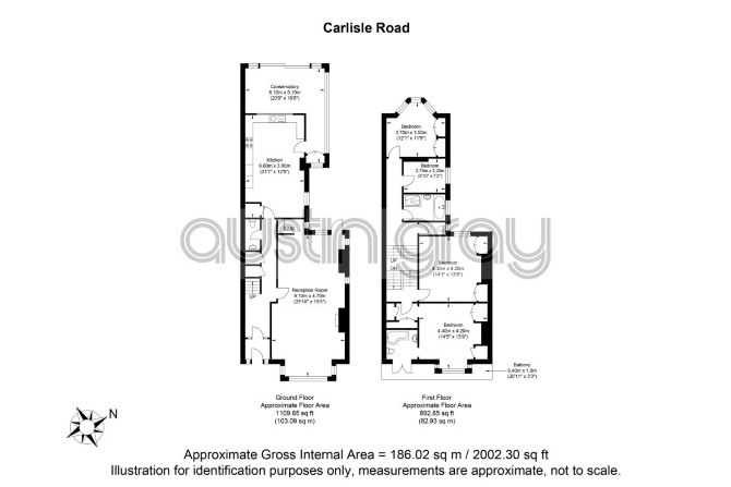 GROUND FLOOR Reception Room - 9.10 x 4.70 Kitchen - 6.60 x 3.80 Conservatory - 6.10 x 5.10 WC FIRST FLOOR Balcony - 6.40 x 1.0 Bedroom - 4.40 x 4.20 Bedroom - 4.30 x 4.20 Bedroom - 2.70 x 2.20 Bedroom - 3.70 x 3.50 Bathroom Shower room/WC Total Floor Area - 186.02 sq.m.