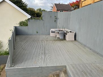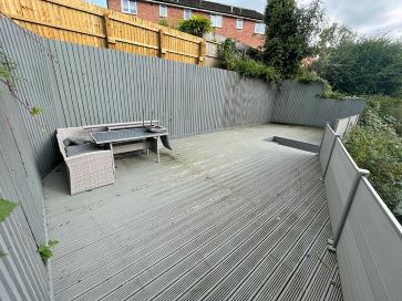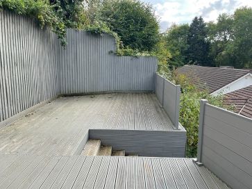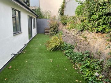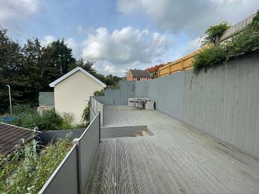 Parking area with solid store to one side and block paved area to the other side. Level area immediately to the rear of the property laid with artificial lawn and attractive feature stone steps leading to extensive level decked private sitting area.