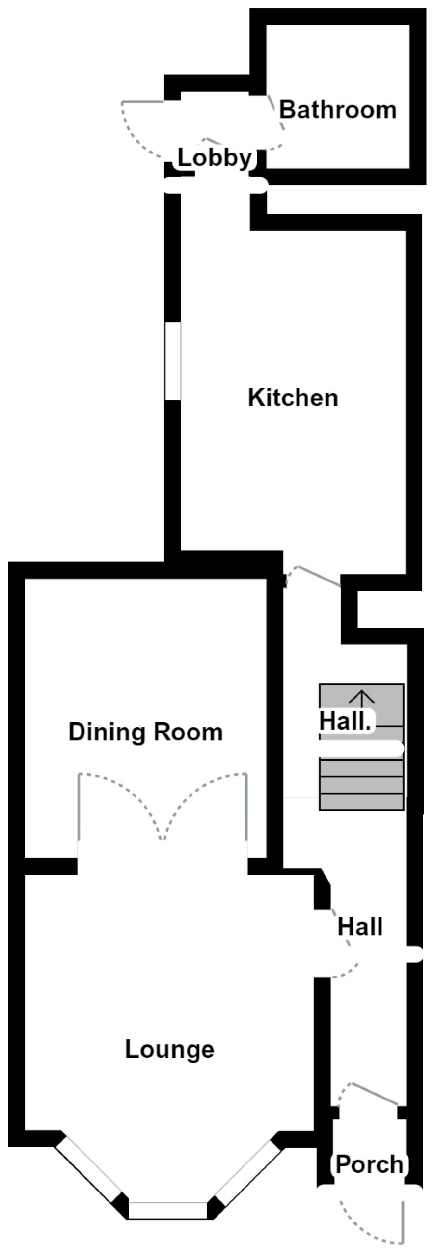 Hallway, lounge with dividing doors to sitting room, dining room, kitchen, lobby, bathroom.