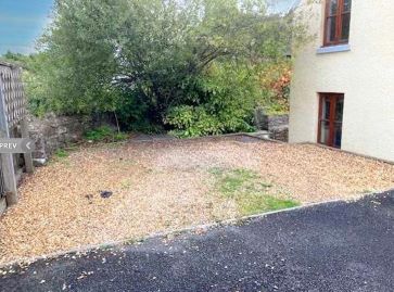 Stone walled front forecourt with side path to a raised gravelled area.