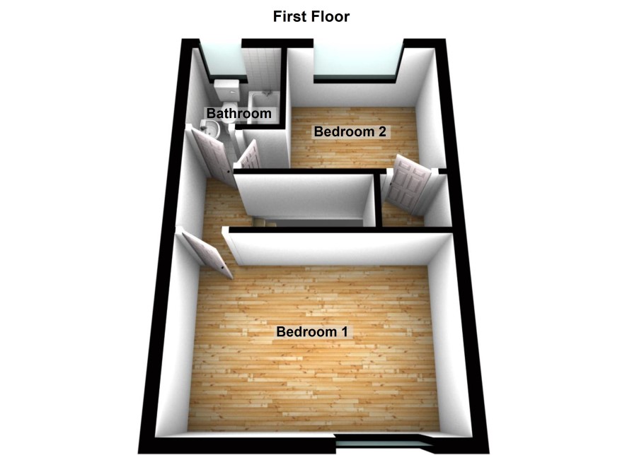Bedroom 1 (14' 2" x 9' 9" or 4.31m x 2.97m), bedroom 2 (8' 8" Max x 8' 2" or 2.64m Max x 2.48m) and a bathroom.