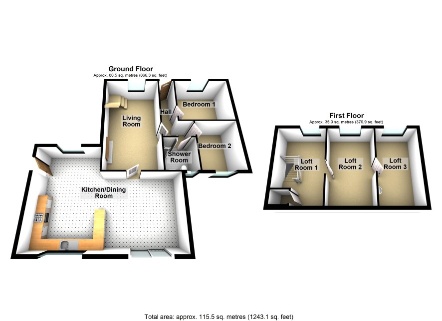 Hall, 20’ x 11’ living room, 26’ x 16’ family/kitchen/dining room, two bedrooms and shower room.