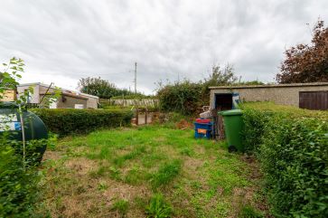 To the front is a lawned garden area, with mature shrubs, and a shed. To the rear is an enclosed garden with mature hedges and an outside shed.