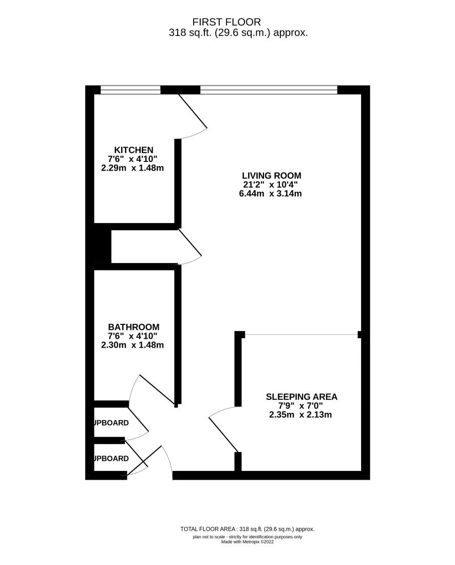 Living room, kitchen, bathroom and sleeping area.