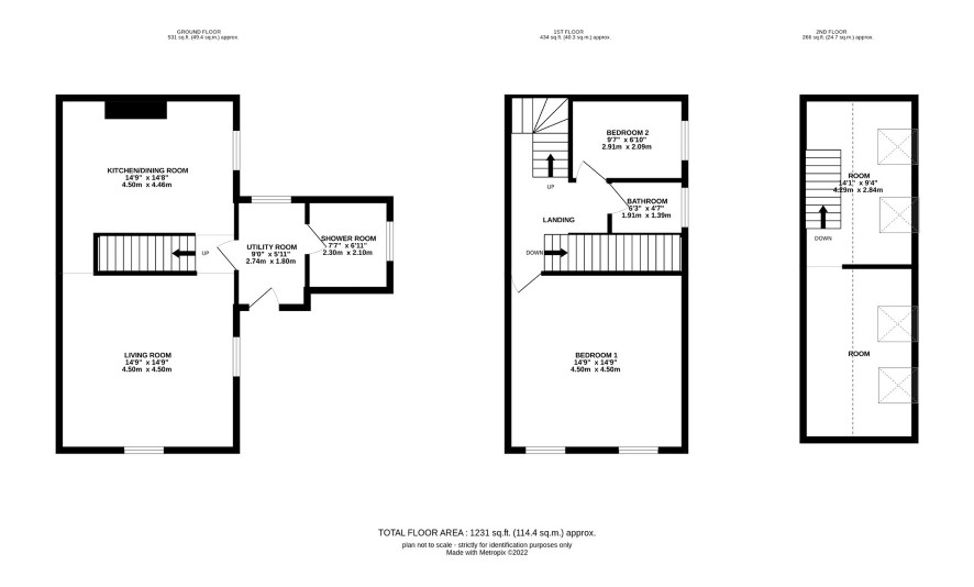 Utility room, shower room, living room, kitchen/dining room.