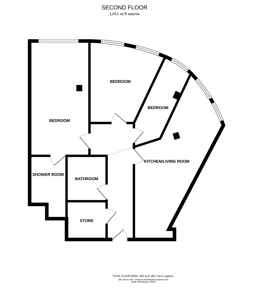 Living room, kitchen, three bedrooms, bathroom, shower room and store