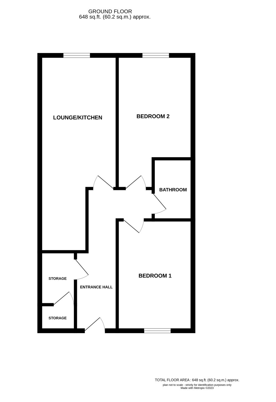 Kitchen/living area, two bedrooms, storage cupboard and bathroom.