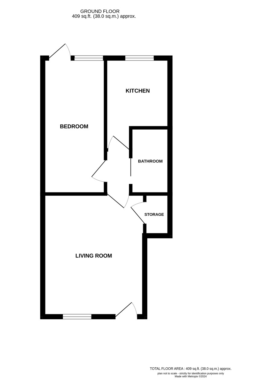 Living room, kitchen, bedroom, bathroom and storage.