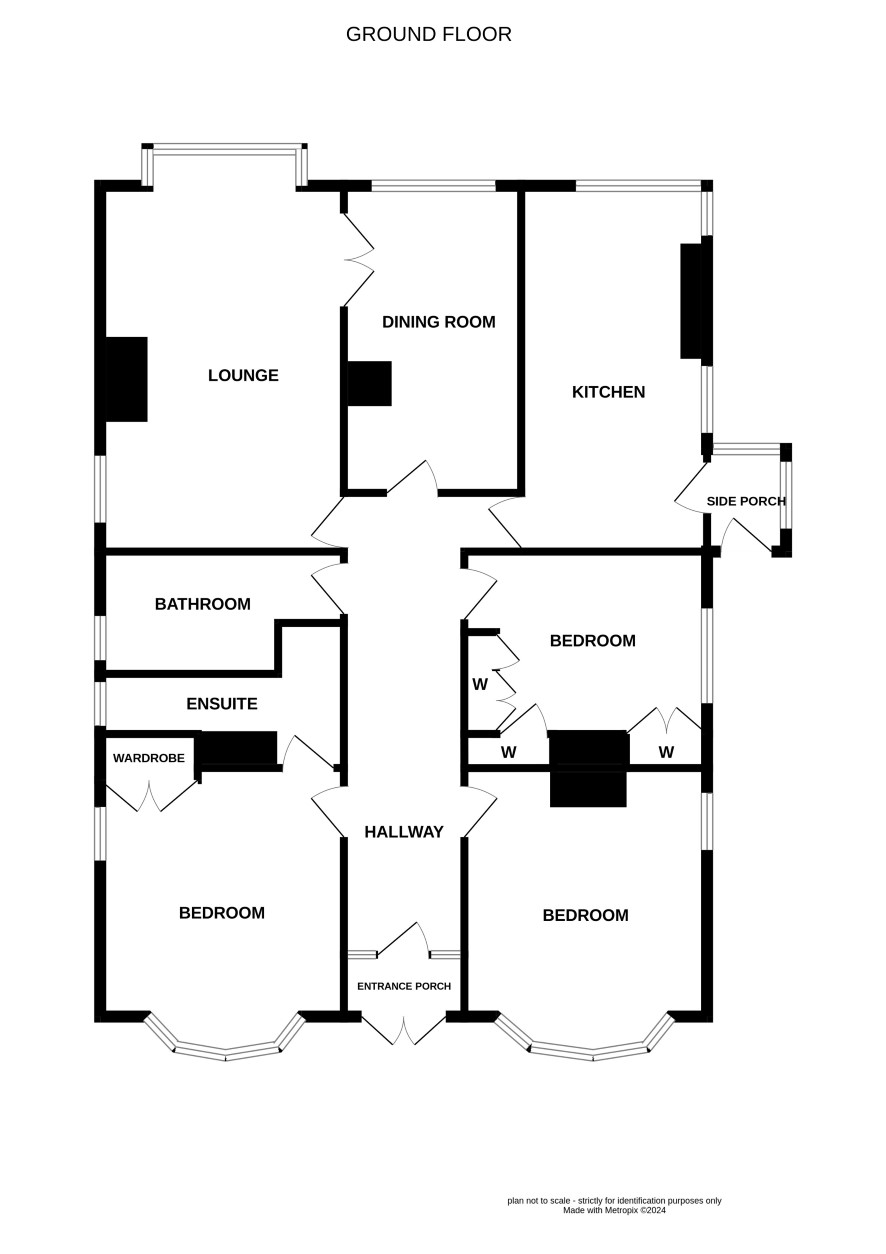 Entrance porch, hallway, lounge, dining room, kitchen, three bedrooms (one en-suite) and house bathroom.
