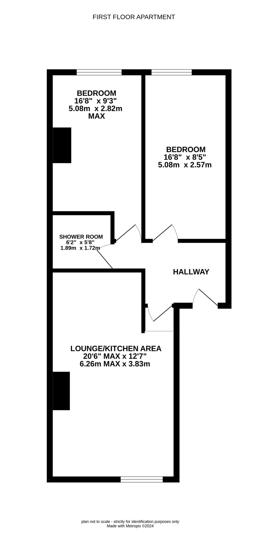 Lounge/kitchen area, two bedrooms and shower room.