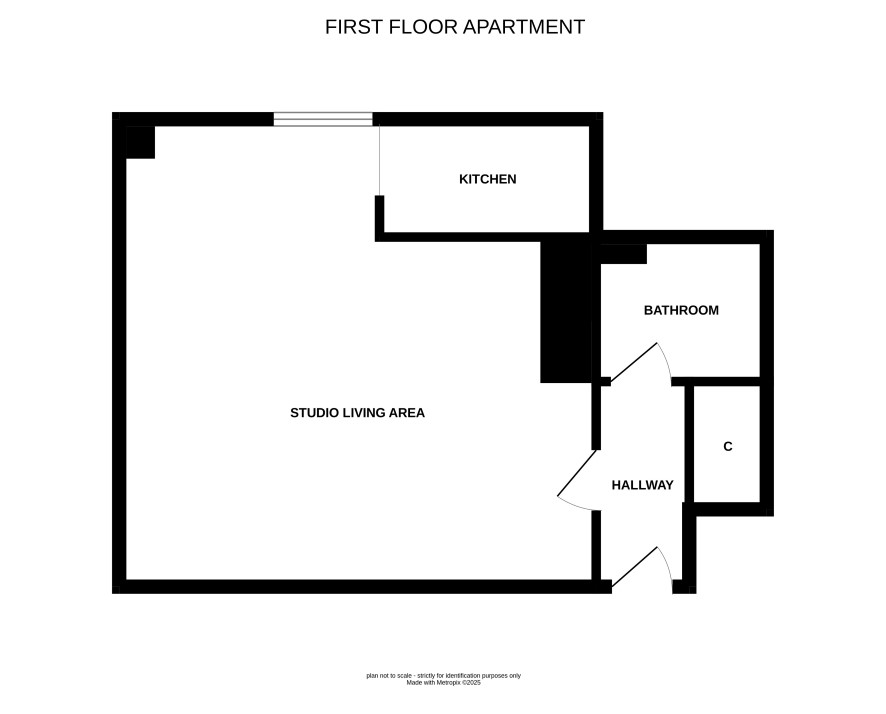 Studio living area and bathroom.