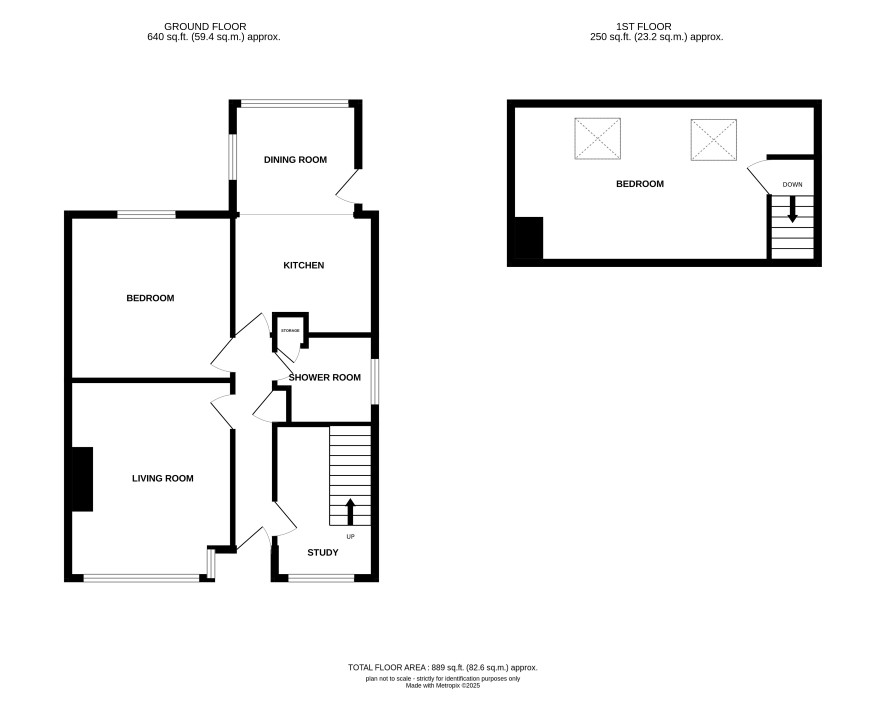 Living room, dining room, kitchen, two bedrooms and a shower room.