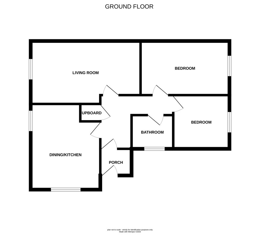 Living room, dining/kitchen, two bedrooms and bathroom.
