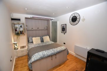 Kitchen area, bedroom and shower room.