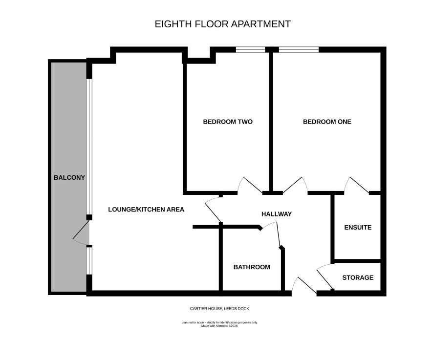 Lounge/kitchen area, two bedrooms, bathroom with ensuite and balcony.