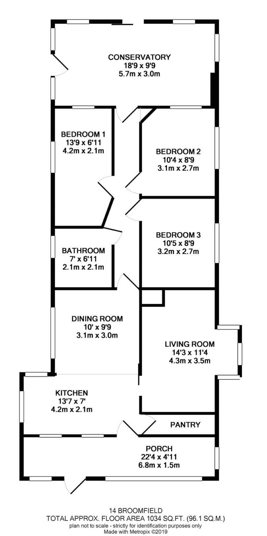 Porch, kitchen, dining room, pantry, living room, three bedrooms, bathroom and conservatory.