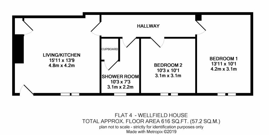 Living kitchen, hall, two bedrooms and shower room